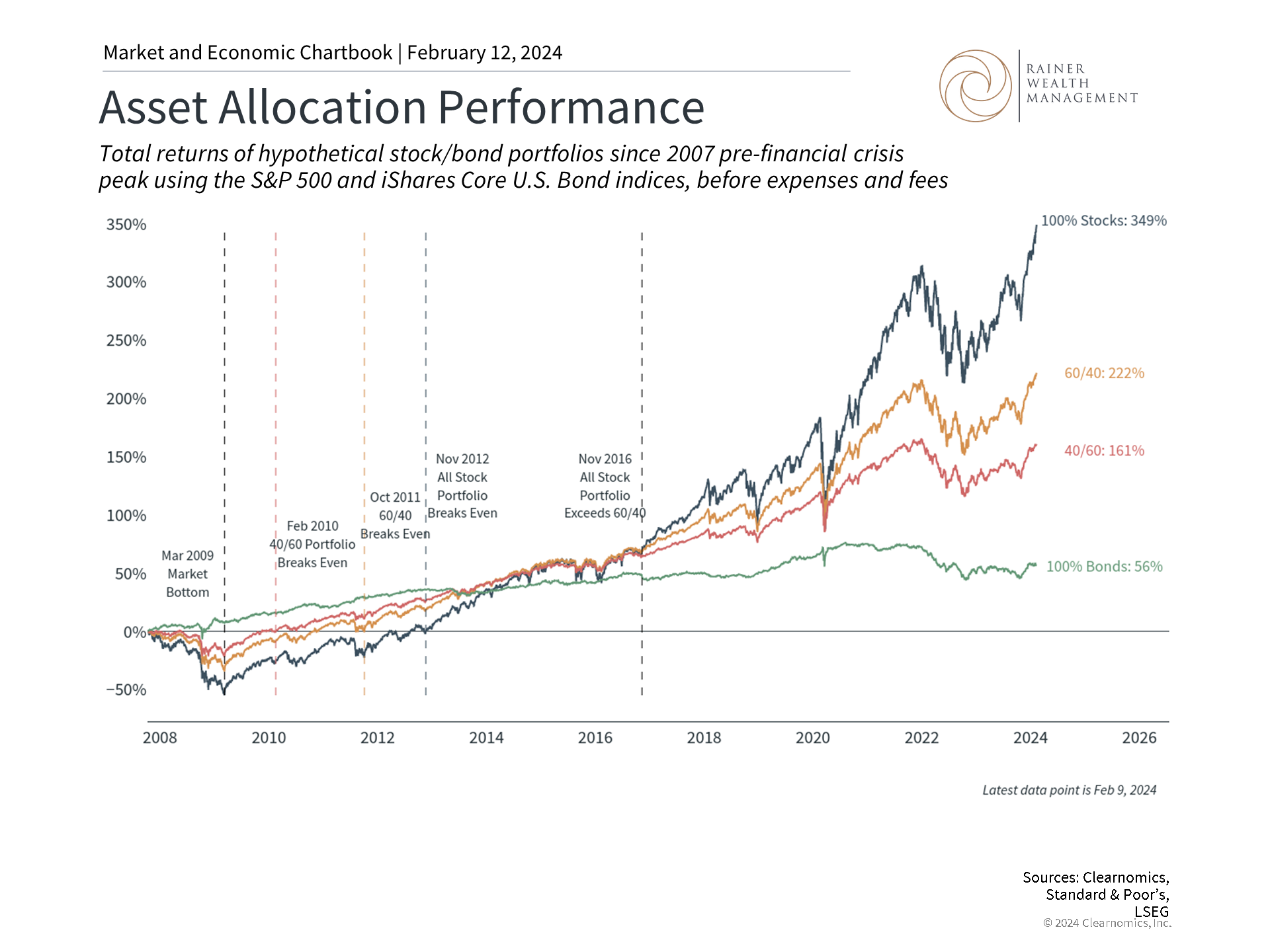The accompanying chart shows four different asset allocation portfolios and highlights how different their paths have been since the 2008 financial crisis. Clearly, an all-stock portfolio would have performed best over the past 15 years. However, there are few investors who can stomach losses on the order of 50% over the course of years.