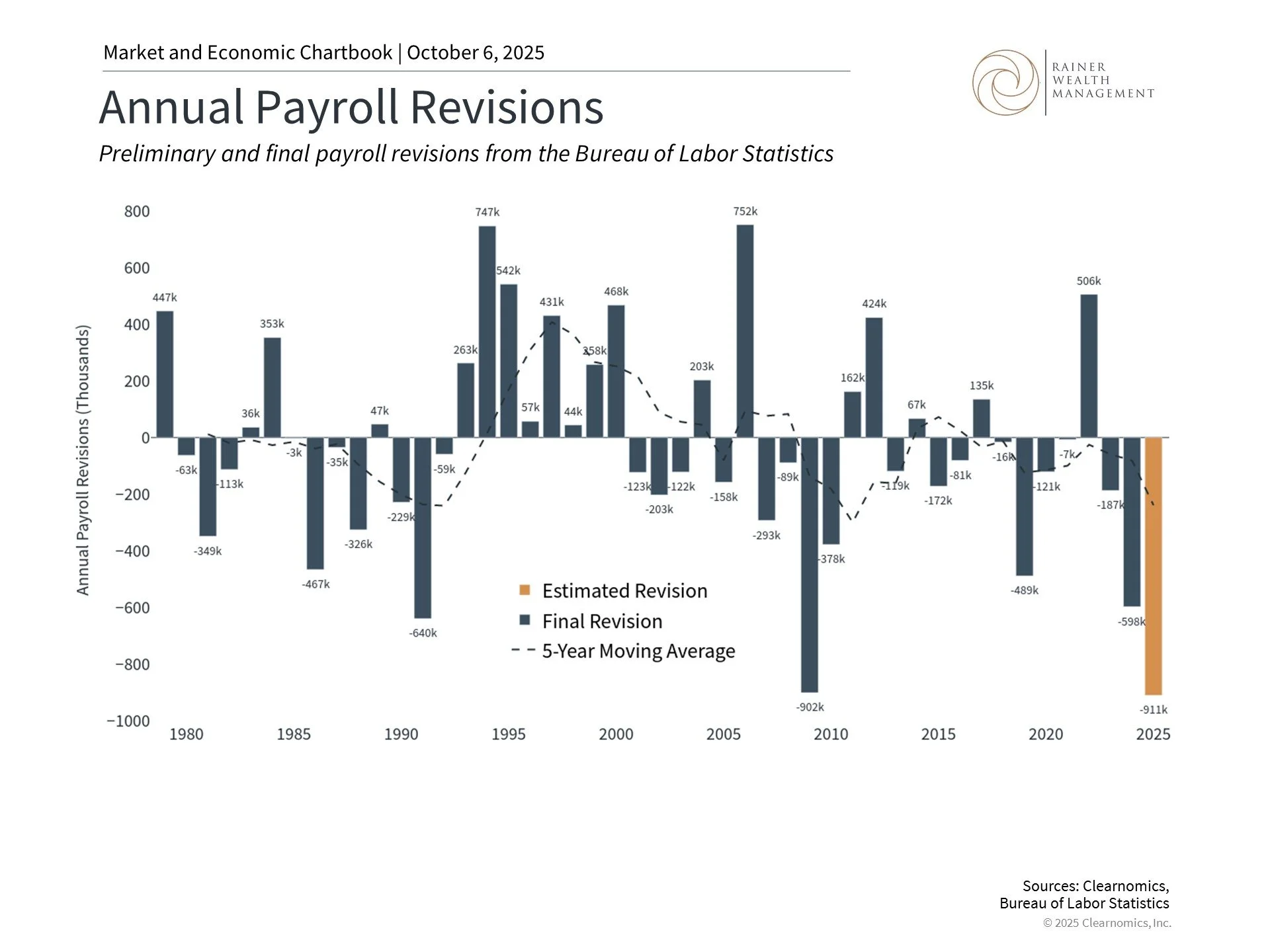 This chart shows the Bureau of Labor Statistics' annual benchmark revisions to nonfarm payroll employment data, which adjust the preliminary monthly job counts based on more comprehensive data from employers. These benchmark revisions are typically released each February, covering the 12-month period up the March of the previous year.
