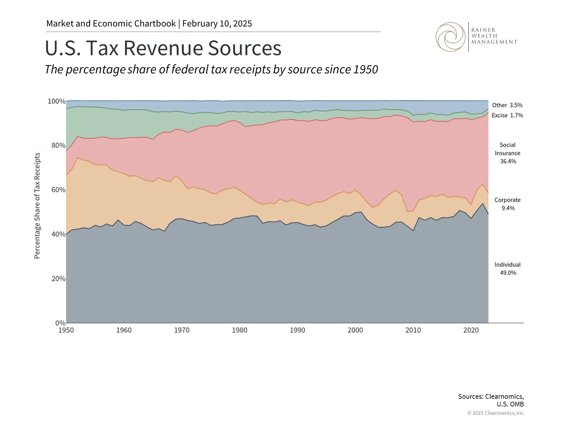 This chart shows the percentage share of federal tax receipts by source since 1950. Percentage shares may not add to 100% due to rounding.