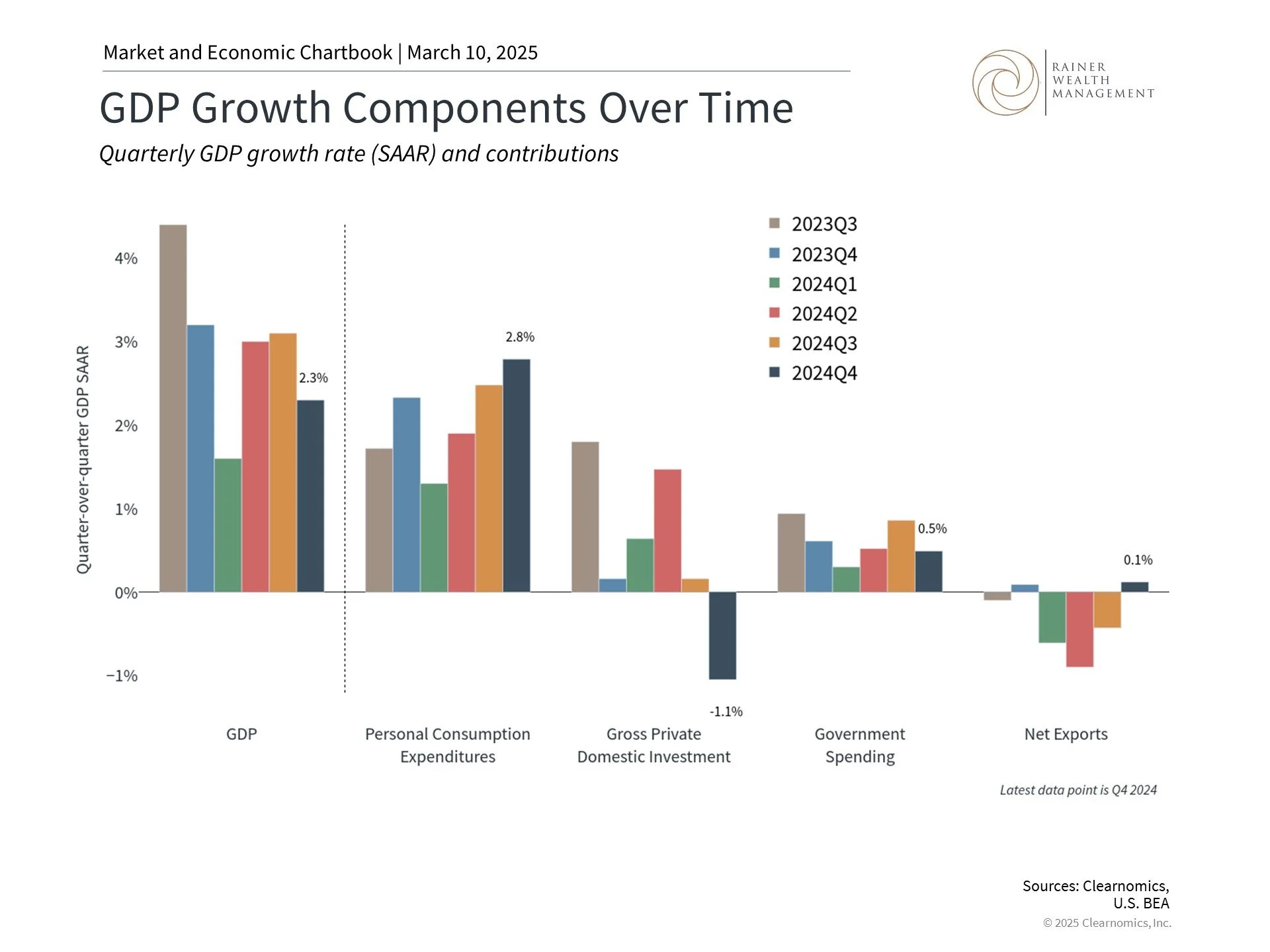 This chart shows quarterly GDP growth on a seasonally adjusted annual rate (SAAR) for the last four quarters. Growth is broken down into its percentage point contributions.
