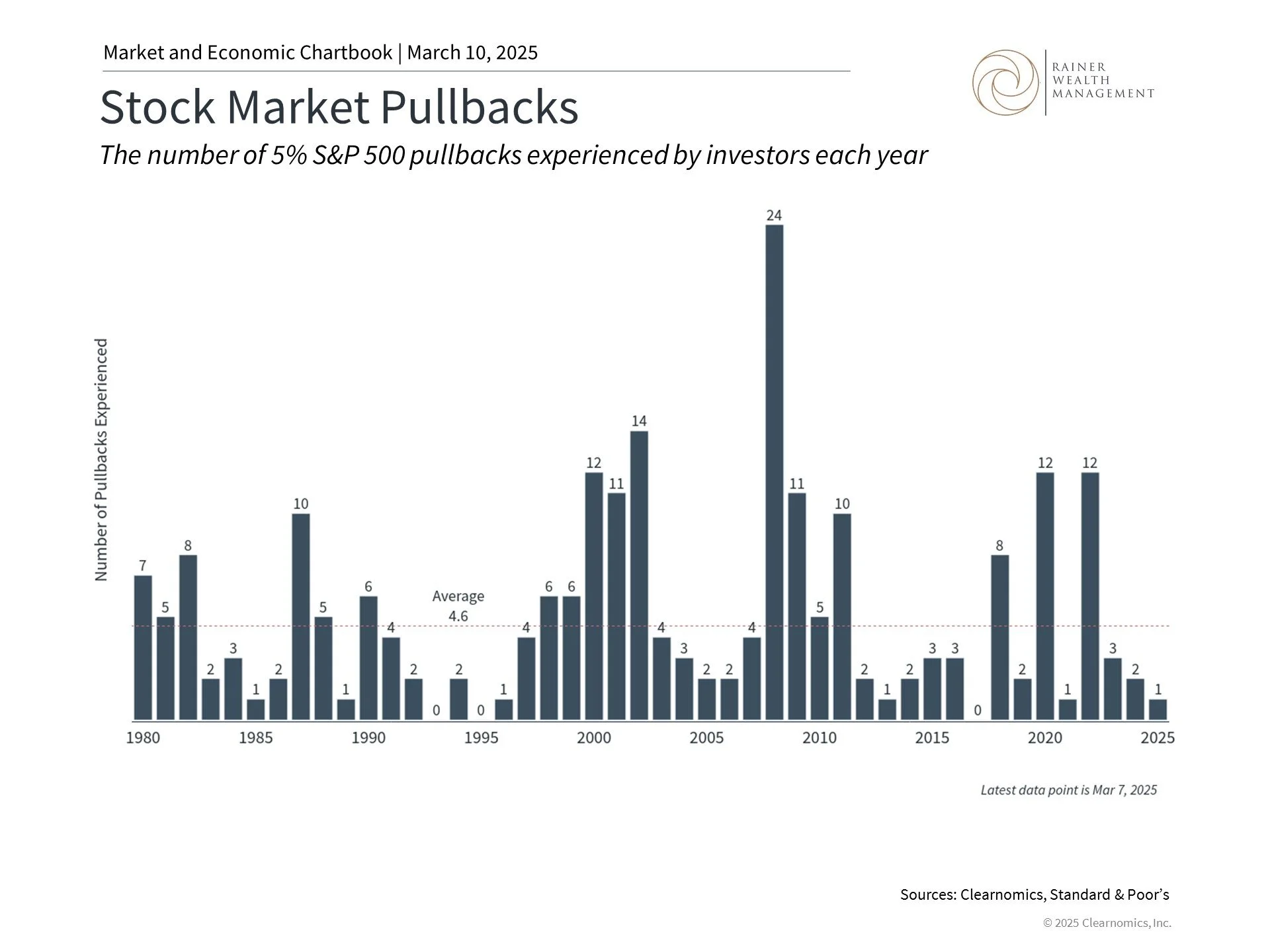 Similarly, short-term market pullbacks are a natural part of investing. As the accompanying chart shows, the S&P 500 experiences pullbacks on a regular basis, even as it has risen in the long run. It’s important to maintain a broader perspective amid heightened economic concerns.