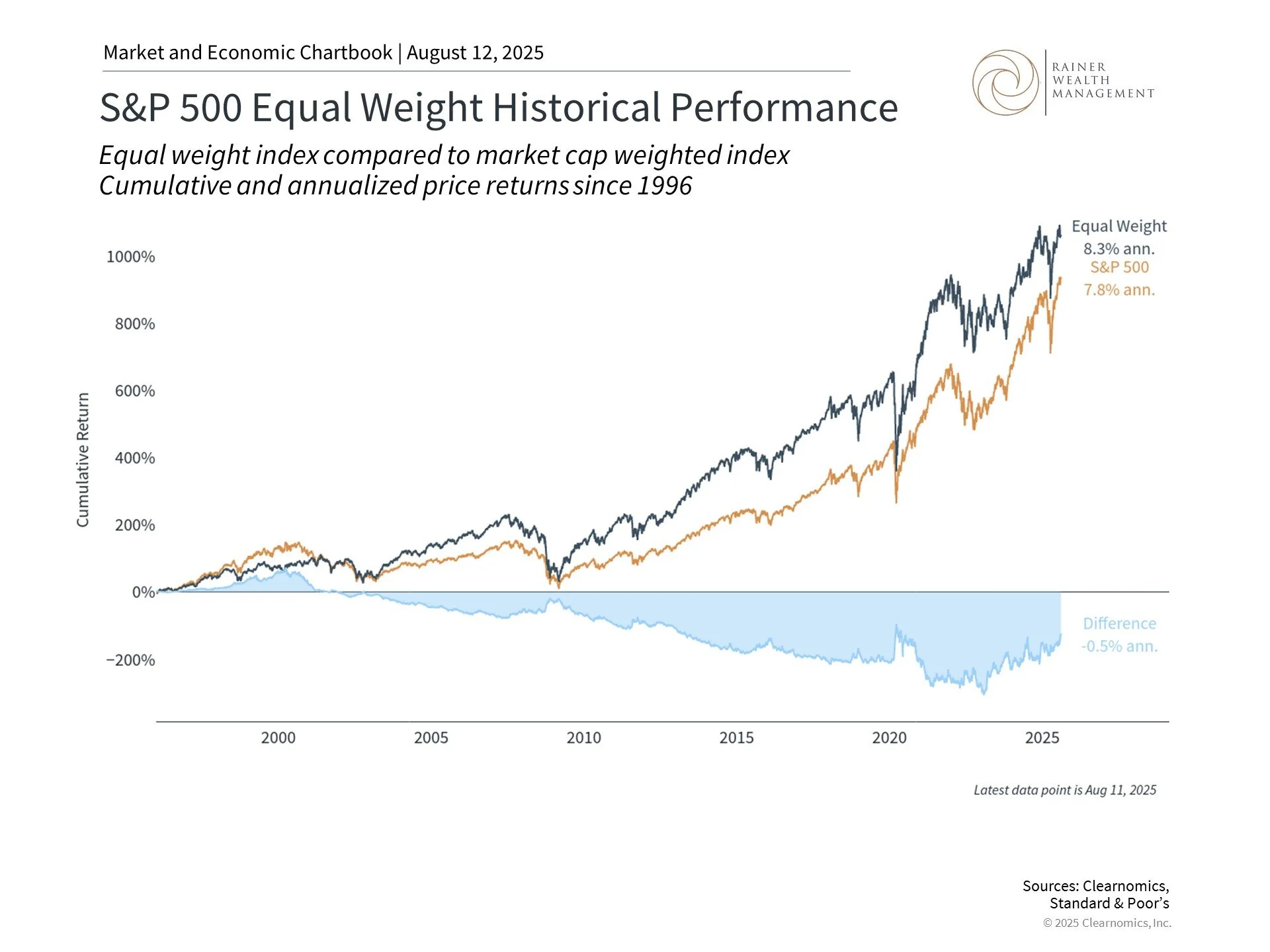 For perspective, consider the equal-weighted S&P 500 shown in the chart above, which gives the same importance to each company regardless of size. This approach has historically provided different return patterns than the standard market-capitalization weighted index, sometimes performing better when large companies struggle.