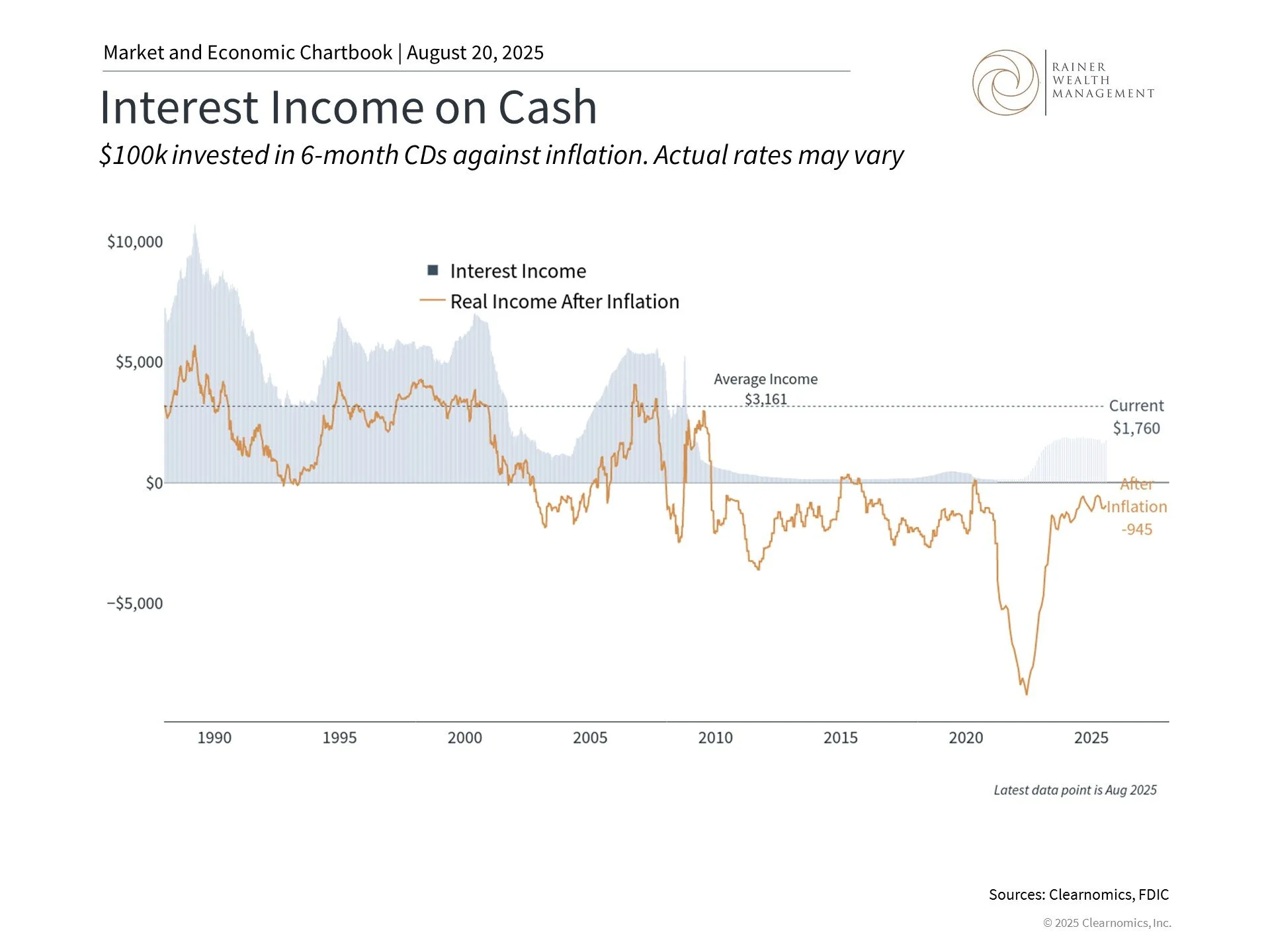 While these increases are notable, inflation is still well below the double-digit rates experienced from 2021 to 2022. However, even if tariffs do not cause sudden jumps in inflation, they may raise the average level of prices over time, eroding the value of cash. This is especially true if wage gains don’t keep up with price increases, and if investors do not have long-term asset allocations that can exceed inflation rates.