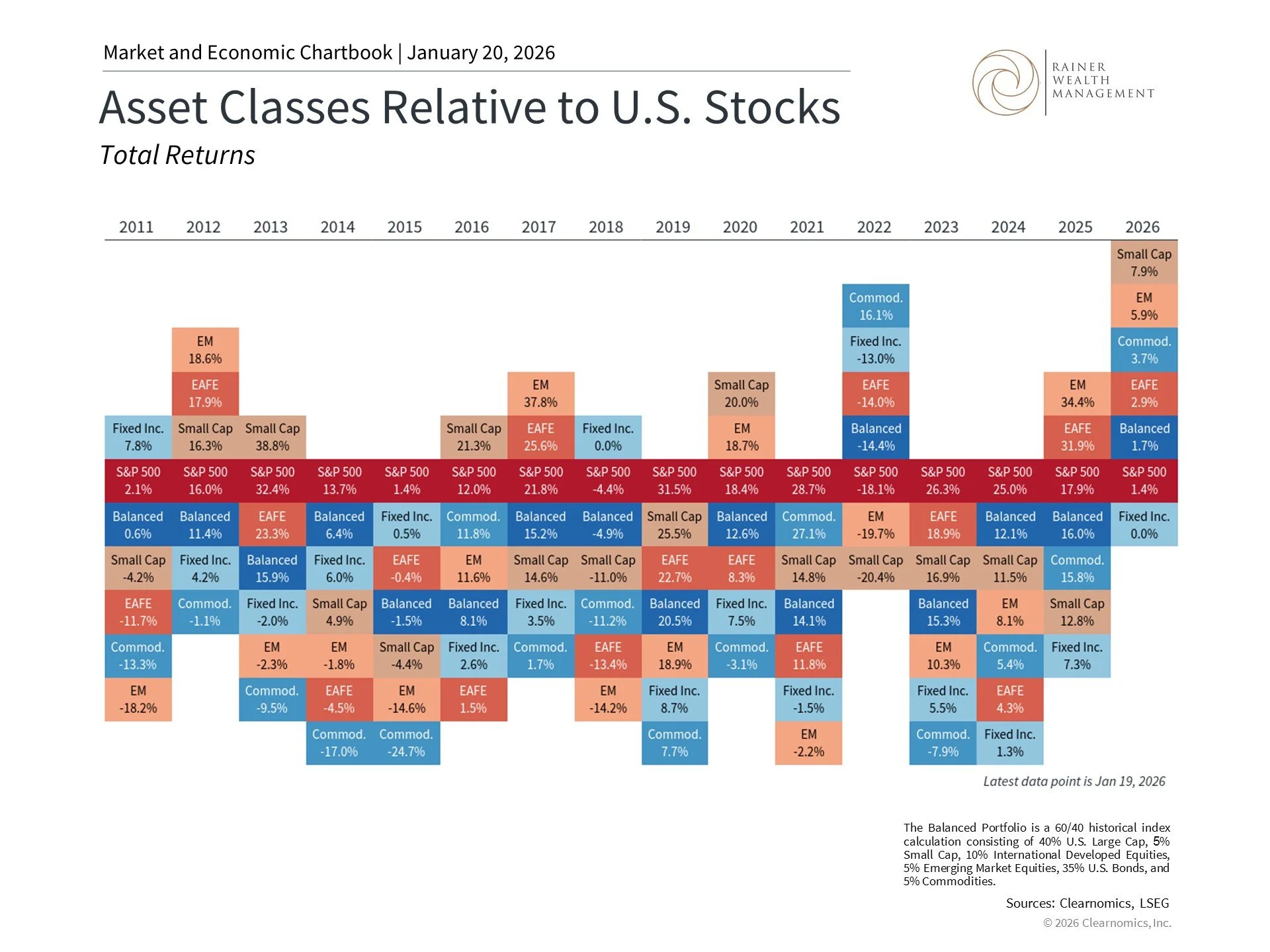 This chart shows the annual total returns for varying asset classes. Asset classes included are MSCI Emerging Markets Index (EM), MSCI Developed Markets Index (EAFE), MSCI World Small Cap Index (Small Cap), S&P 500, balanced portfolio, fixed income, and MSCI World Commodity Producers Index (comm.). The balanced portfolio is a historical 60/40 portfolio consisting of 40% U.S. large cap, 5% small cap, 10% international developed equities, 5% emerging market equities, 35% U.S. bonds, and 5% commodities.