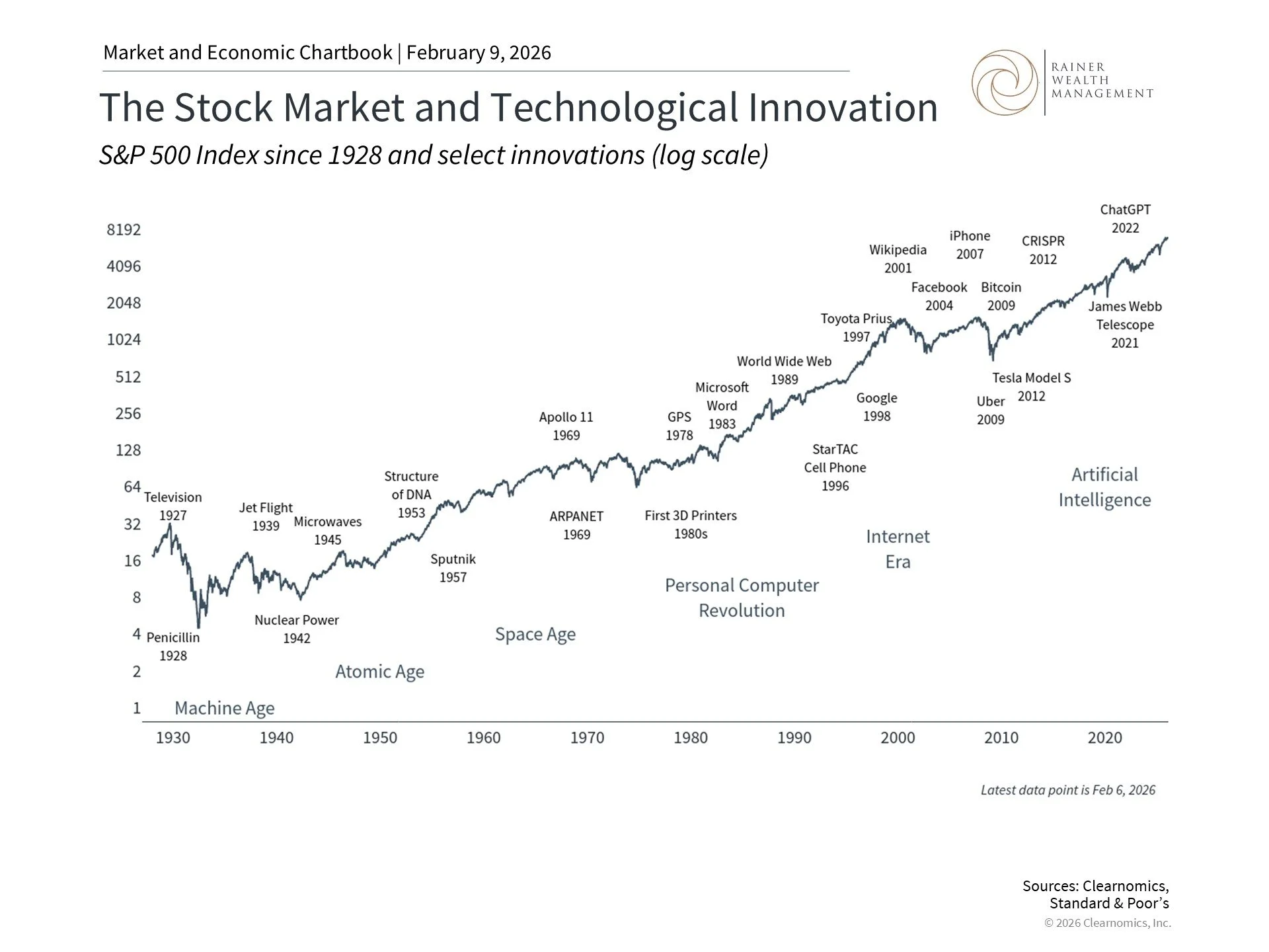 This chart tracks the S&P 500 price index using a logarithmic scale. On this log scale the Y-axis labels increase by a factor of two, so each step along the axis is a doubling of the index value. This provides a better depiction of growth rates than linear price levels which would be dominated by more recent activity. Select innovations have been labeled.