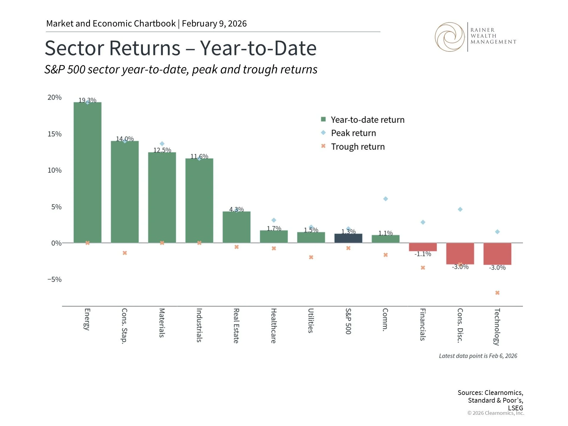 This chart shows the S&P 500 sector price returns year-to-date. The bars show the year-to-date returns, the blue diamonds show the peak return year-to-date, and the orange x shows the trough return year-to-date.