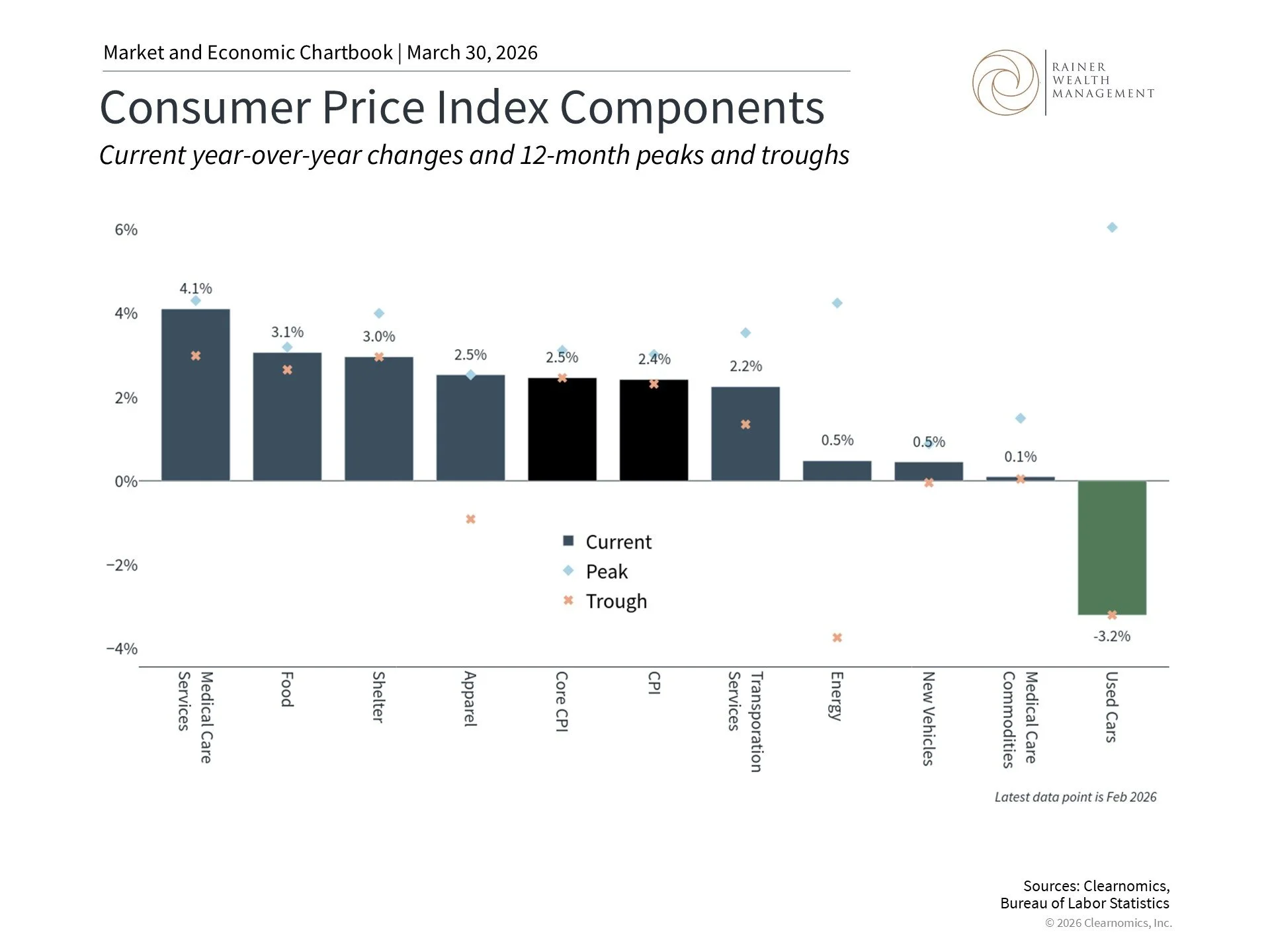 This chart shows current levels, troughs, and peaks within the past 12-months for the Consumer Price Index (CPI) components, headline CPI, and core CPI. The blue bars denote the current level of year-over-year inflation for components of CPI that make up headline CPI. The black bars show the current levels of CPI and core CPI. Blue diamonds and orange crosses in each column show the peak and trough of year-over-year inflation respectively.