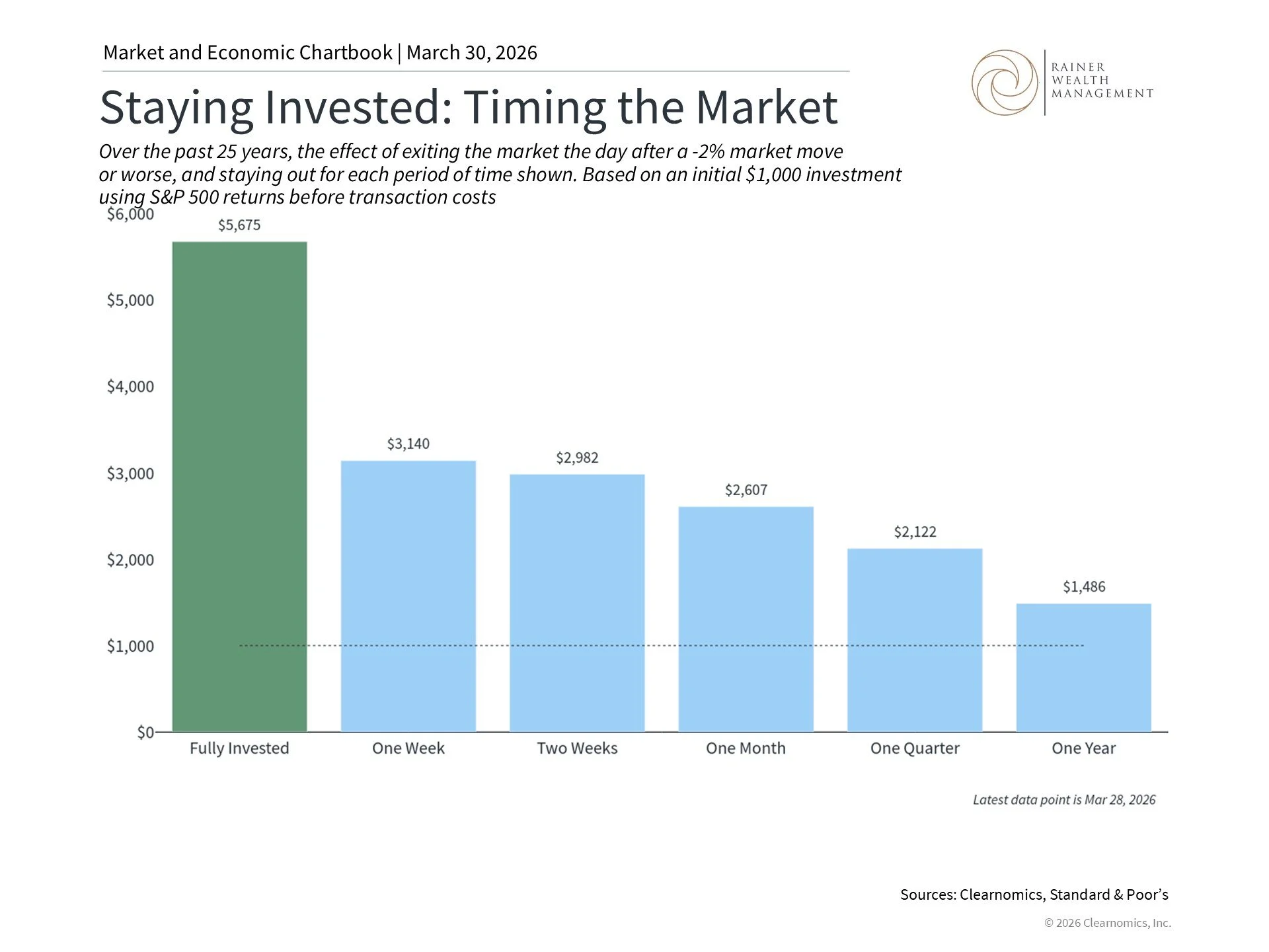 This is the foundation of why staying invested has historically been the best approach for long-term investors. Some may be tempted to time the market, but the challenge is not just knowing when to get out, but also when to get back in. The accompanying chart illustrates that even missing a single week after volatile days has historically been negative for investment outcomes. While there are no guarantees, this is historically because the market's best days have occurred shortly after its worst days. Investors who stepped to the sidelines missed the very rebounds they were waiting for.
