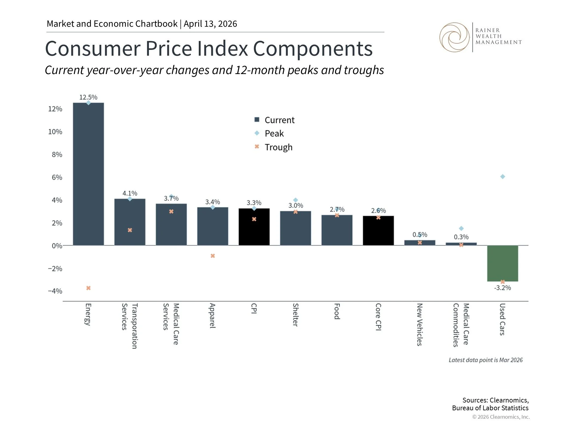 This chart shows current levels, troughs, and peaks within the past 12-months for the Consumer Price Index (CPI) components, headline CPI, and core CPI. The blue bars denote the current level of year-over-year inflation for components of CPI that make up headline CPI. The black bars show the current levels of CPI and core CPI. Blue diamonds and orange crosses in each column show the peak and trough of year-over-year inflation respectively.