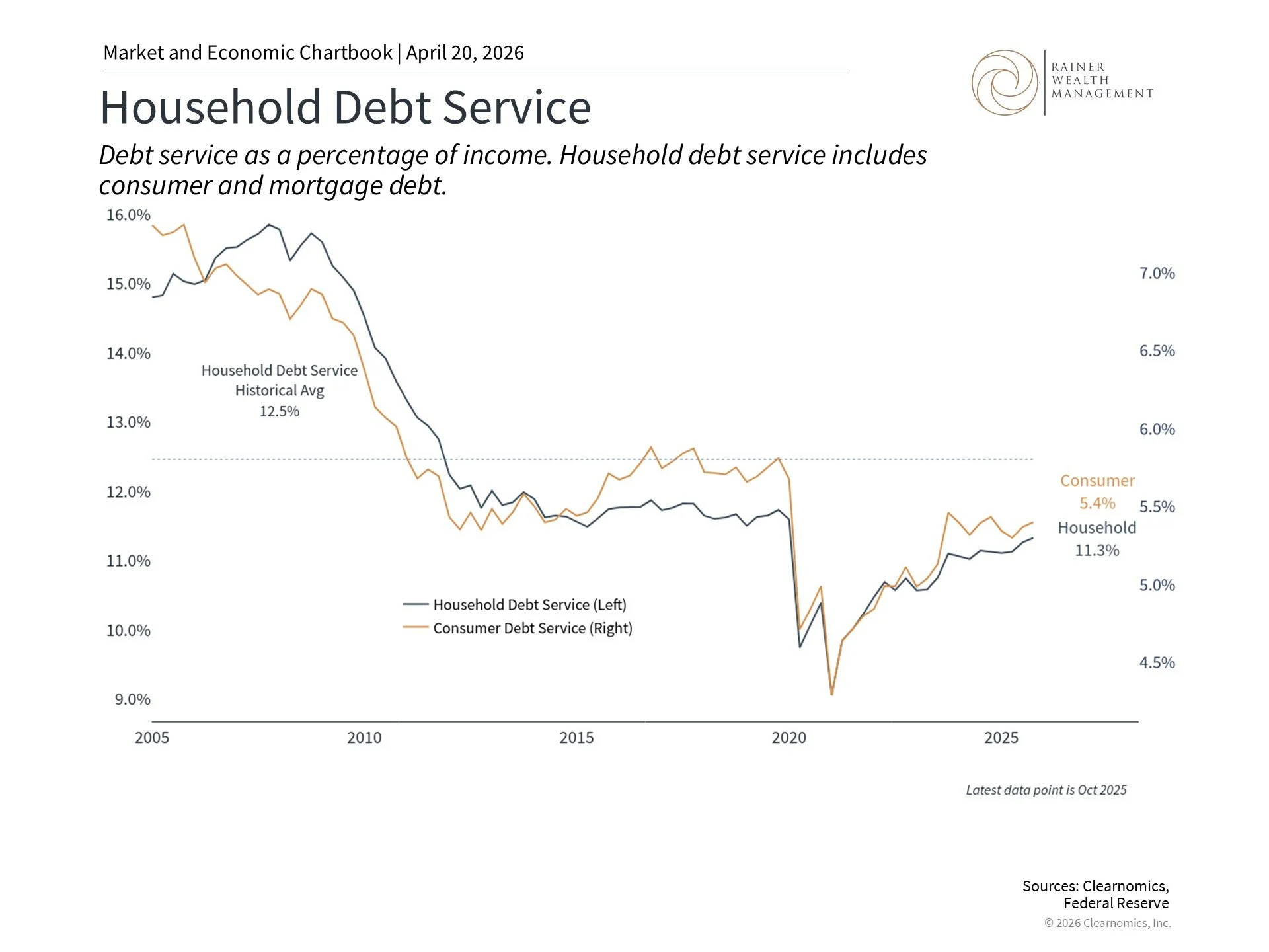 This chart shows the household and consumer debt service payments as a percent of disposable personal income. The household debt service is on the left axis and consumer debt service is on the right axis. The dotted blue line denotes the average household debt service percentage.